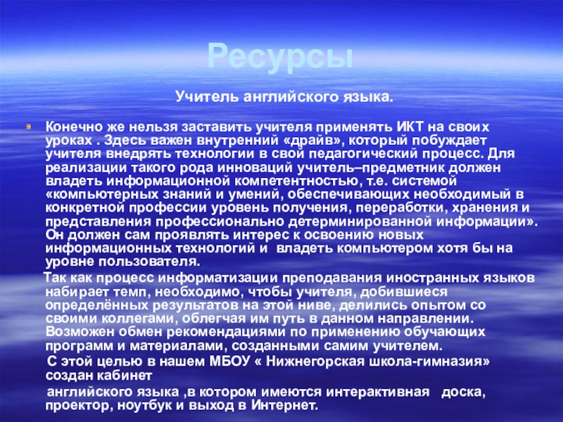 на своих уроках . Здесь важен внутренний «драйв», который побуждает учителя внедрять технологии в свой педагогический процесс. Для реализации такого рода инноваций учитель–предметник должен владеть информационной компетентностью, т.е. системой «компьютерных знаний и умений, обеспечивающих необходимый в конкретной профессии уровень получения, переработки, хранения и представления профессионально детерминированной информации». Он должен сам проявлять интерес к освоению новых информационных технологий и владеть компьютером хотя бы на уровне пользователя.