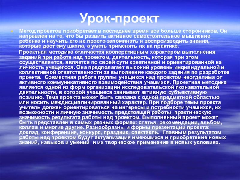 Проектная методика отличается кооперативным характером выполнения заданий при работе над проектом, деятельность, которая при этом осуществляется, является по своей сути креативной и ориентированной на личность учащегося. Она предполагает высокий уровень индивидуальной и коллективной ответственности за выполнение каждого задания по разработке проекта. Совместная работа группы учащихся над проектом неотделима от активного коммуникативного взаимодействия учащихся. Проектная методика является одной из форм организации исследовательской познавательной деятельности, в которой учащиеся занимают активную субъективную позицию. Тема проекта может быть связана с одной предметной областью или носить междисциплинированный характер. При подборе темы проекта учитель должен ориентироваться на интересы и потребности учащихся, их возможности и личную значимость предстоящей работы, практическую значимость результата работы над проектом. Выполненный проект может быть представлен в самых разных формах: статья, рекомендации, альбом, коллаж и многие другие. Разнообразны и формы презентации проекта: доклад, конференция, конкурс, праздник, спектакль. Главным результатом работы над проектом будут актуализация имеющихся и приобретение новых знаний, навыков и умений и их творческое применение в новых условиях.