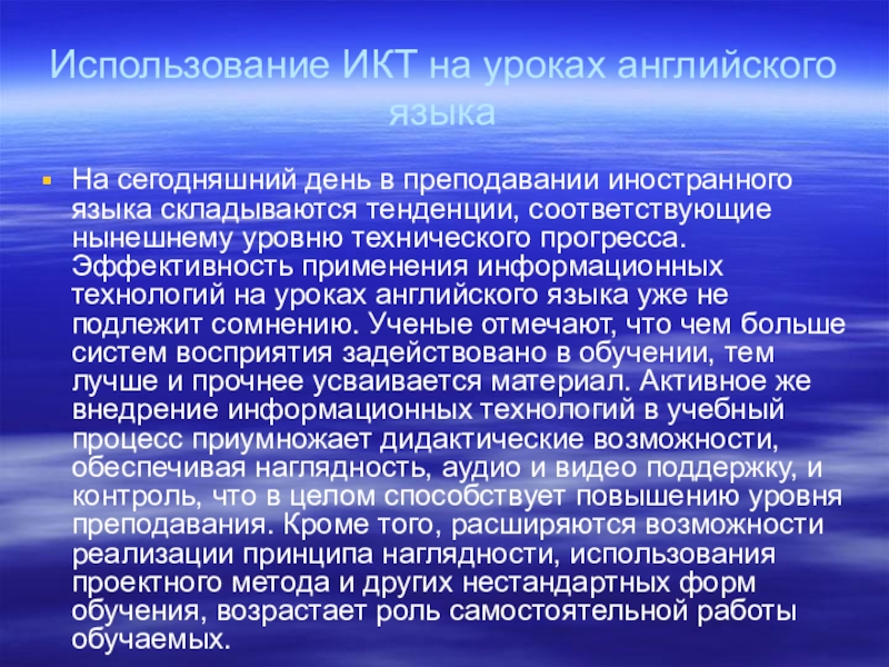 языка складываются тенденции, соответствующие нынешнему уровню технического прогресса. Эффективность применения информационных технологий на уроках английского языка уже не подлежит сомнению. Ученые отмечают, что чем больше систем восприятия задействовано в обучении, тем лучше и прочнее усваивается материал. Активное же внедрение информационных технологий в учебный процесс приумножает дидактические возможности, обеспечивая наглядность, аудио и видео поддержку, и контроль, что в целом способствует повышению уровня преподавания. Кроме того, расширяются возможности реализации принципа наглядности, использования проектного метода и других нестандартных форм обучения, возрастает роль самостоятельной работы обучаемых.