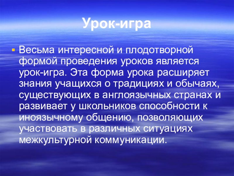 Весьма интересной и плодотворной формой проведения уроков является урок-игра. Эта