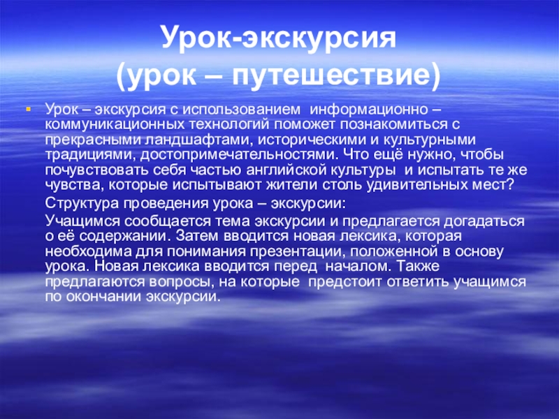 Учащимся сообщается тема экскурсии и предлагается догадаться о её содержании. Затем вводится новая лексика, которая необходима для понимания презентации, положенной в основу урока. Новая лексика вводится перед началом. Также предлагаются вопросы, на которые предстоит ответить учащимся по окончании экскурсии.