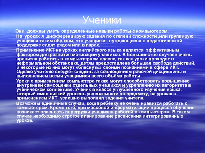 Применение ИКТ на уроках английского языка является эффективным фактором для развития мотивации учащихся. В большинстве случаев очень нравится работать в компьютерном классе, так как уроки проходят в неформальной обстановке, детям предоставлена большая свобода действий, и некоторые из них могут «блеснуть» своими познаниями в сфере ИКТ. Однако учителю следует следить за соблюдением рабочей дисциплины и выполнением всеми учащимися всего объёма работы.