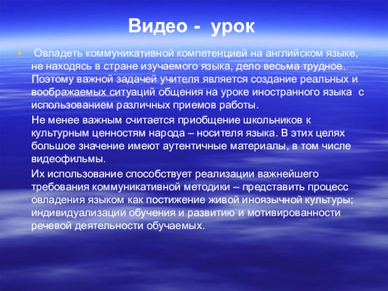 Их использование способствует реализации важнейшего требования коммуникативной методики – представить процесс овладения языком как постижение живой иноязычной культуры; индивидуализации обучения и развитию и мотивированности речевой деятельности обучаемых.