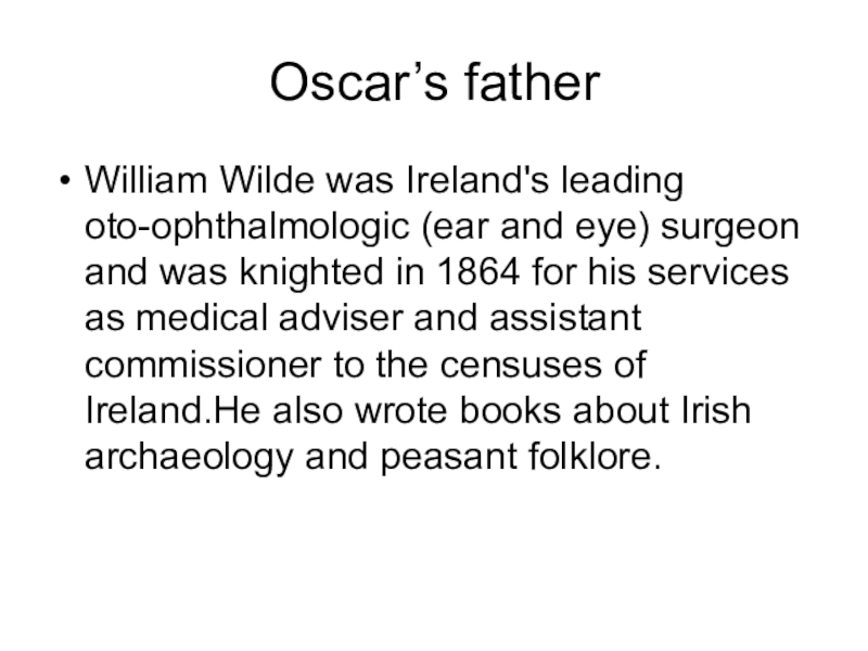 Oscar’s fatherWilliam Wilde was Ireland's leading oto-ophthalmologic (ear and eye) surgeon and was knighted in 1864 for