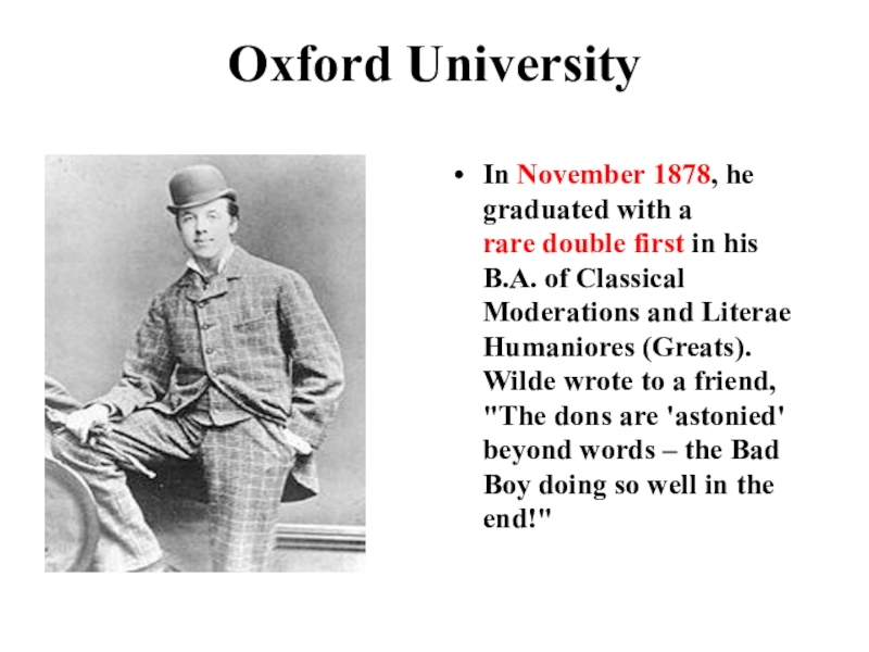 B.A. of Classical Moderations and Literae Humaniores (Greats). Wilde wrote to a friend, "The dons are 'astonied' beyond words – the Bad Boy doing so well in the end!"
