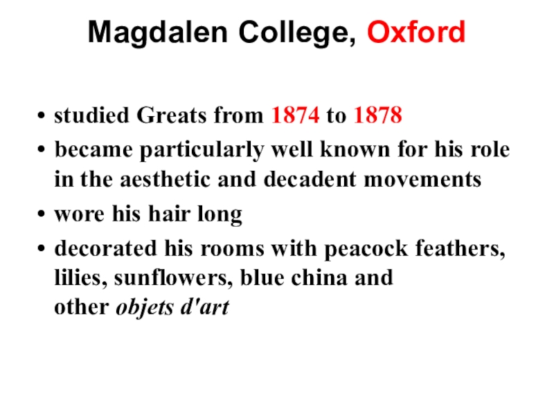 Magdalen College, Oxford studied Greats from 1874 to 1878 became particularly well known for his role in the aesthetic