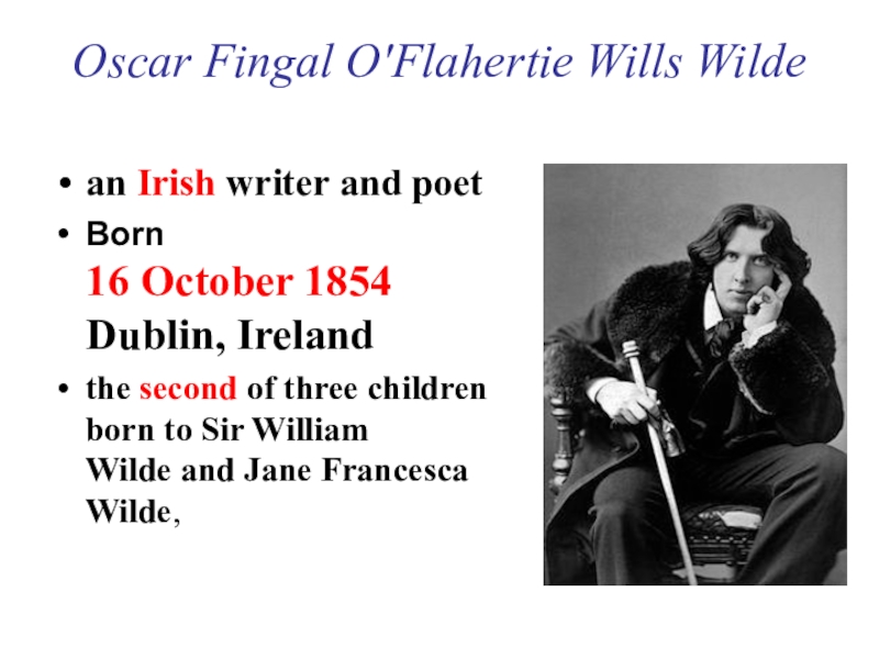 Oscar Fingal O'Flahertie Wills Wilde  an Irish writer and poet Born 16 October 1854 Dublin, Irelandthe second of three children born to Sir William Wilde and Jane Francesca Wilde,