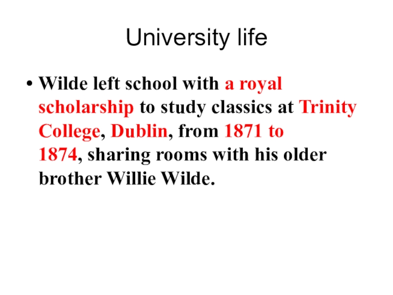 University lifeWilde left school with a royal scholarship to study classics at Trinity College, Dublin, from 1871 to