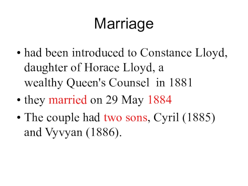 Marriagehad been introduced to Constance Lloyd, daughter of Horace Lloyd, a wealthy Queen's Counsel  in 1881 they married on