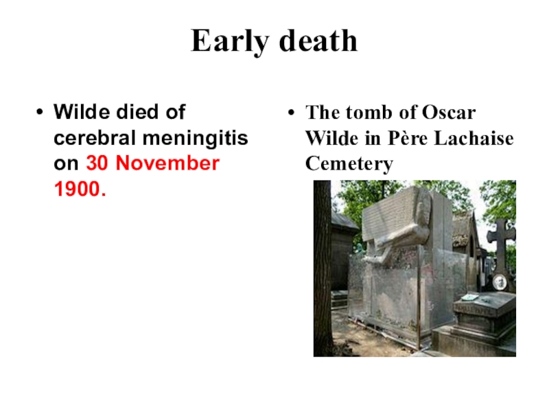 Early deathWilde died of cerebral meningitis on 30 November 1900. The tomb of Oscar Wilde in Père Lachaise Cemetery