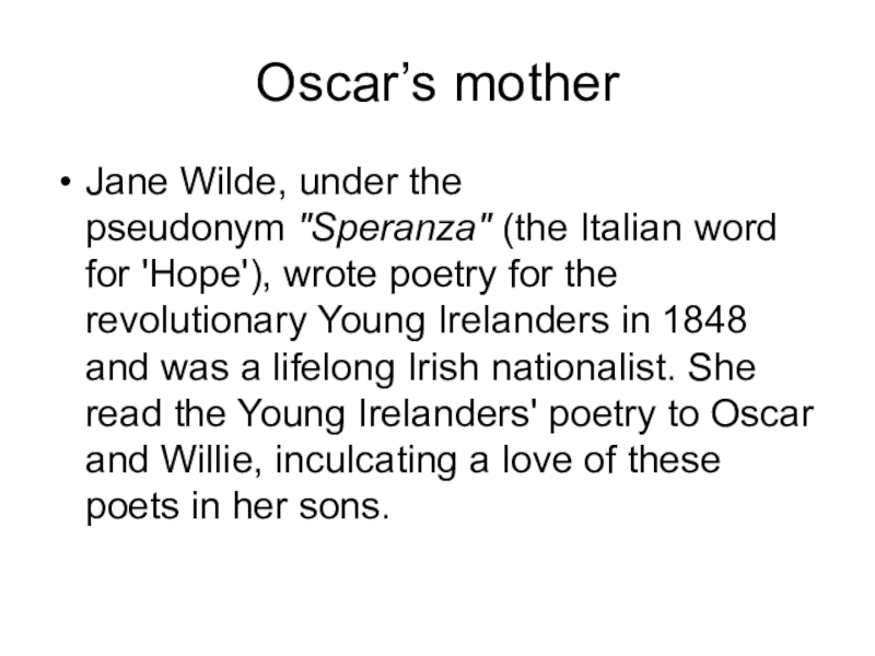 poetry for the revolutionary Young Irelanders in 1848 and was a lifelong Irish nationalist. She read the Young Irelanders' poetry to Oscar and Willie, inculcating a love of these poets in her sons.