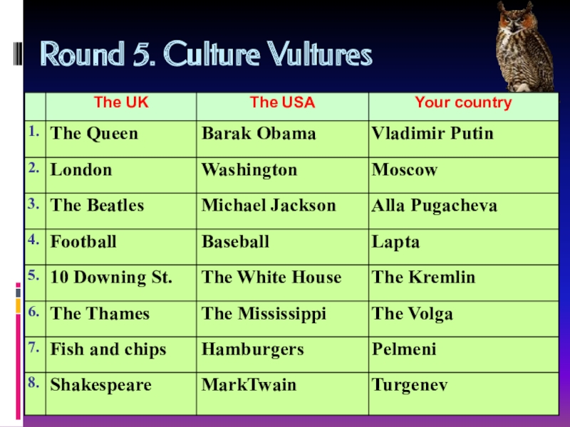 The Thames, Michael Jackson, Washington D.C., 10 Downing St., Baseball, Fish and chips, Mark Twain