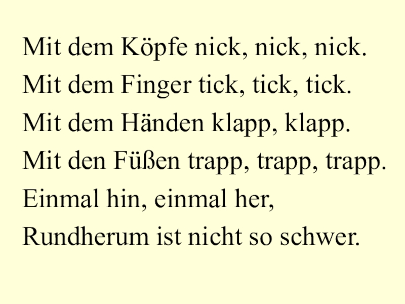 Mit dem Köpfe nick, nick, nick.Mit dem Finger tick, tick, tick.Mit dem Hӓnden klapp, klapp.Mit den Füßen