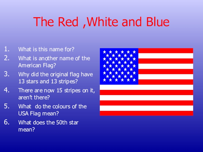 The American flag has different names. One of them is “The Stars and the Stripes”.