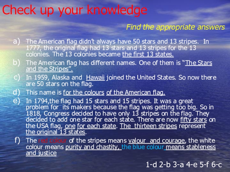 In 1794,the flag had 15 stars and 15 stripes. It was a great problem for its makers because the flag was getting too big. So in 1818, Congress decided to have only 13 stripes on the flag. They decided to add one star for each state. There are now fifty stars on the USA flag, one for each state. The thirteen stripes represent the original 13 states.