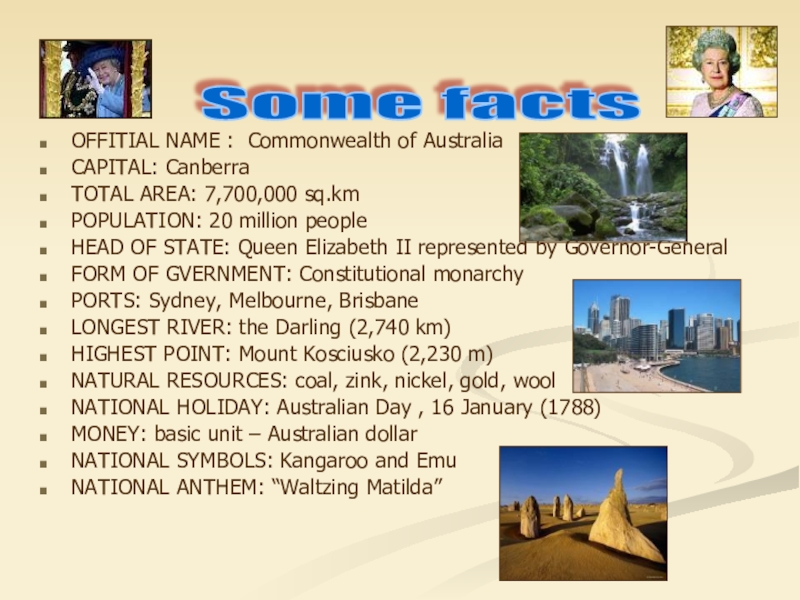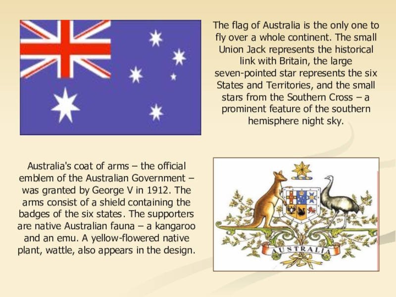 The flag of Australia is the only one to fly over a whole continent. The small Union Jack represents the historical link with Britain, the large seven-pointed star represents the six States and Territories, and the small stars from the Southern Cross – a prominent feature of the southern hemisphere night sky.