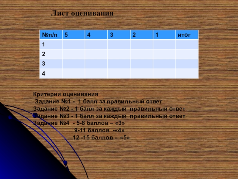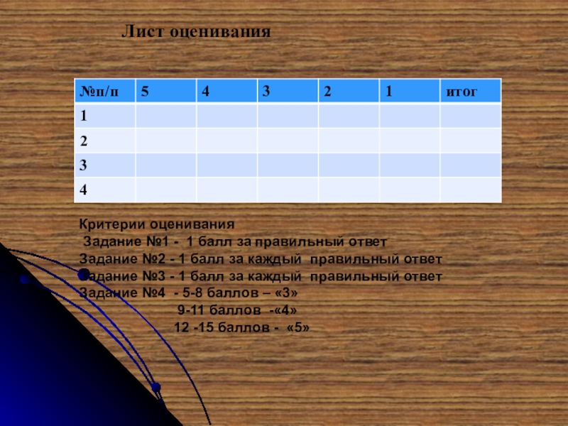 Лист оцениванияКритерии оценивания Задание №1 - 1 балл за правильный ответЗадание №2 - 1 балл за каждый