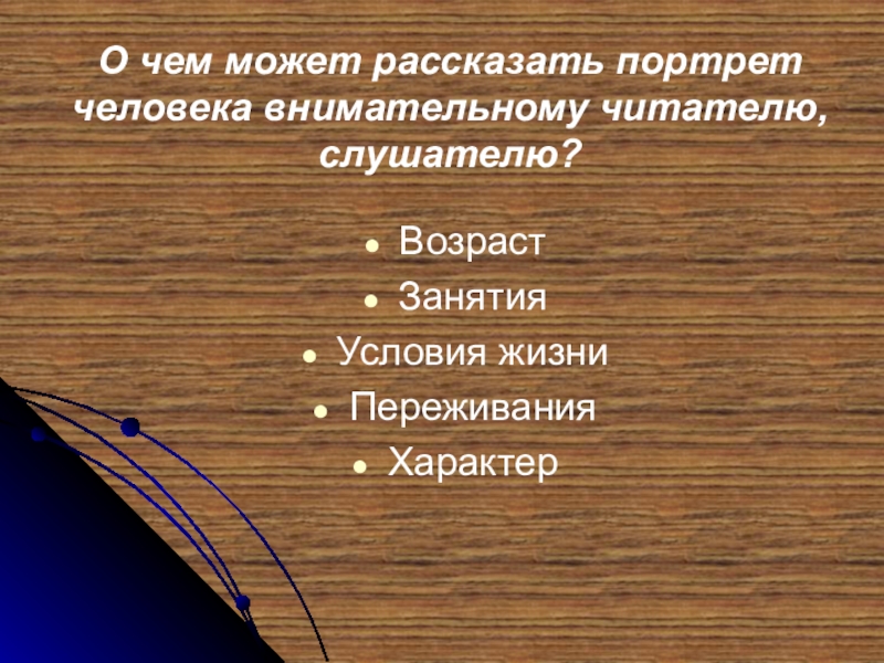 О чем может рассказать портрет человека внимательному читателю, слушателю? ВозрастЗанятияУсловия жизниПереживанияХарактер