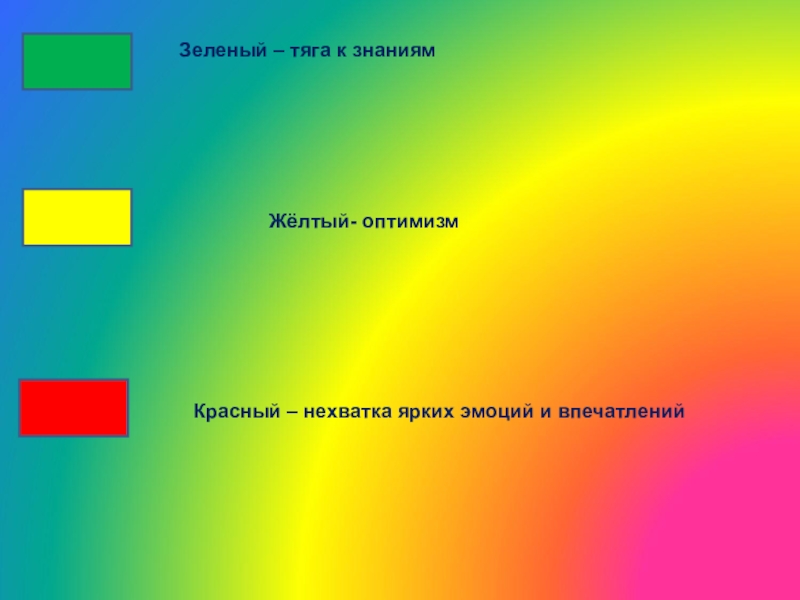 Красный – нехватка ярких эмоций и впечатленийЗеленый – тяга к знаниямЖёлтый- оптимизм