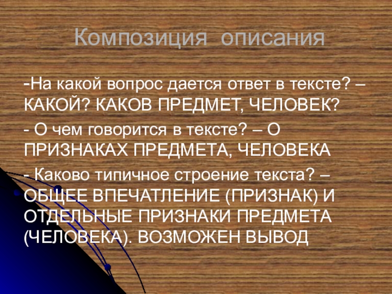Композиция описания -На какой вопрос дается ответ в тексте? – КАКОЙ? КАКОВ ПРЕДМЕТ, ЧЕЛОВЕК?- О чем говорится
