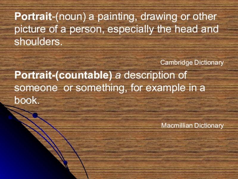 Слайд 5Portrait-(noun) a painting, drawing or other picture of a person, especially