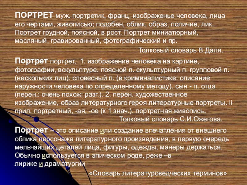 Портрет – это описание или создание впечатления от внешнего облика персонажа литературного произведения, в первую очередь мельчайших деталей лица, фигуры, одежды, манеры держаться. Обычно используется в эпическом роде, реже –в лирике и драматургии