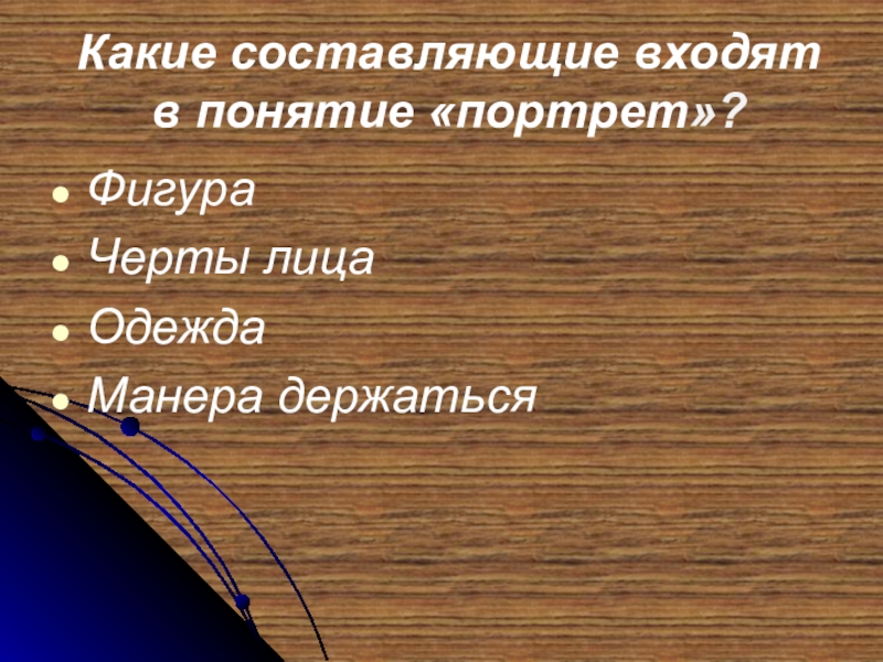 Какие составляющие входят в понятие «портрет»? ФигураЧерты лицаОдеждаМанера держаться