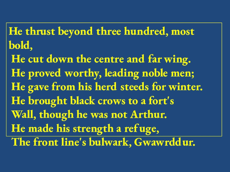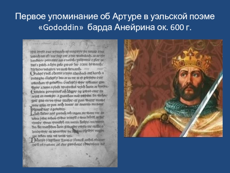 Слайд 4Первое упоминание об Артуре в уэльской поэме «Gododdin» барда Анейрина ок.