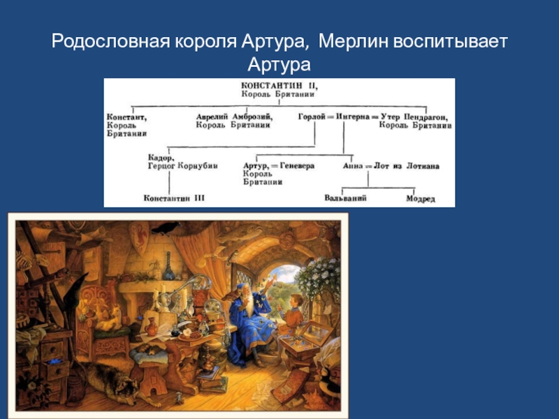Слайд 6Родословная короля Артура, Мерлин воспитывает Артура