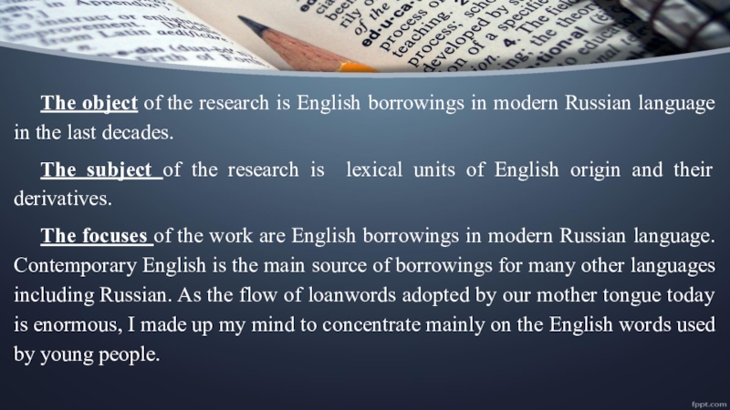 Слайд 3The object of the research is English borrowings in modern Russian language