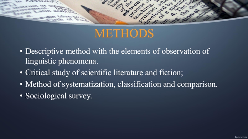 METHODSDescriptive method with the elements of observation of linguistic phenomena.Critical study of scientific literature and fiction;Method of
