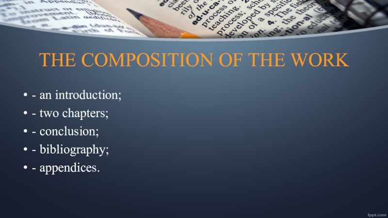 THE COMPOSITION OF THE WORK- an introduction; - two chapters; - conclusion;- bibliography;- appendices.