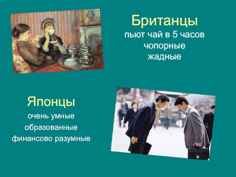 Британцы пьют чай в 5 часов чопорные жадныеЯпонцыочень умныеобразованныефинансово разумные