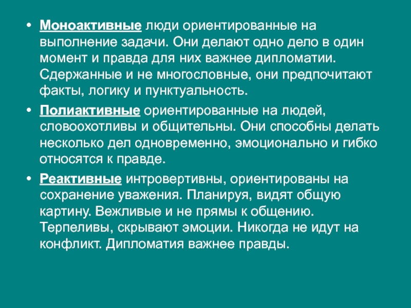 Моноактивные люди ориентированные на выполнение задачи. Они делают одно дело в один момент и правда для них