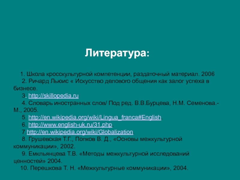 10. Перешкова Т. Н. «Межкультурные коммуникации», 2004.