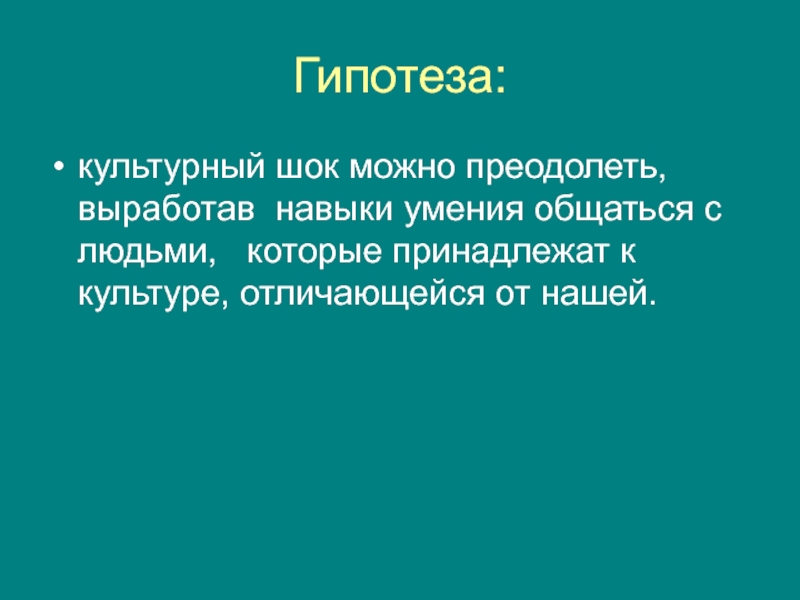Гипотеза:культурный шок можно преодолеть, выработав навыки умения общаться с людьми,  которые принадлежат к культуре, отличающейся от