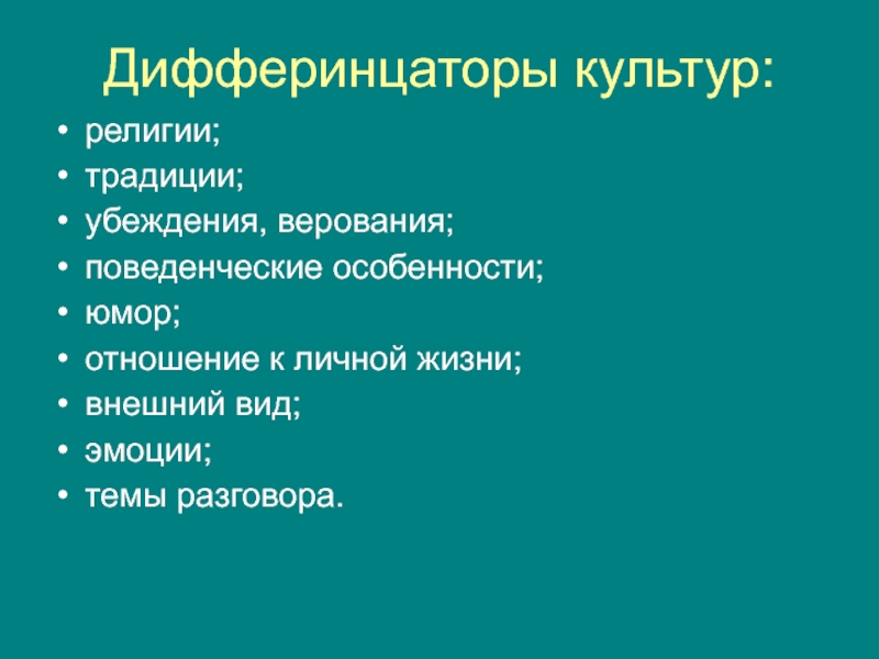 Дифферинцаторы культур:религии;традиции;убеждения, верования;поведенческие особенности;юмор;отношение к личной жизни;внешний вид;эмоции;темы разговора.