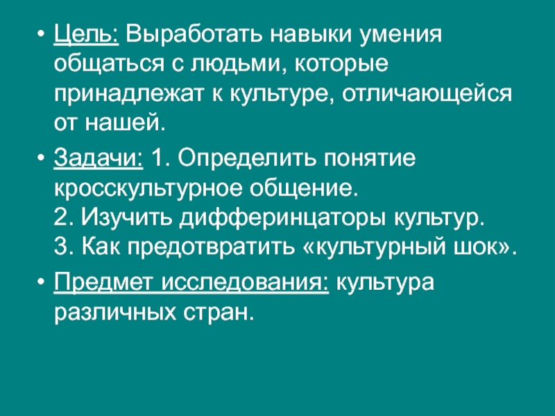 Задачи: 1. Определить понятие кросскультурное общение. 2. Изучить дифферинцаторы культур. 3. Как предотвратить «культурный шок».