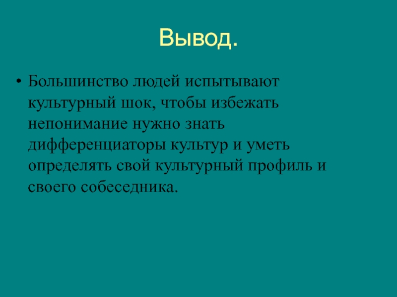 Вывод.Большинство людей испытывают культурный шок, чтобы избежать непонимание нужно знать дифференциаторы культур и уметь определять свой культурный
