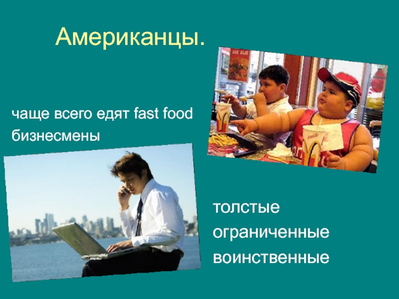 Американцы.чаще всего едят fast foodбизнесменытолстыеограниченныевоинственные