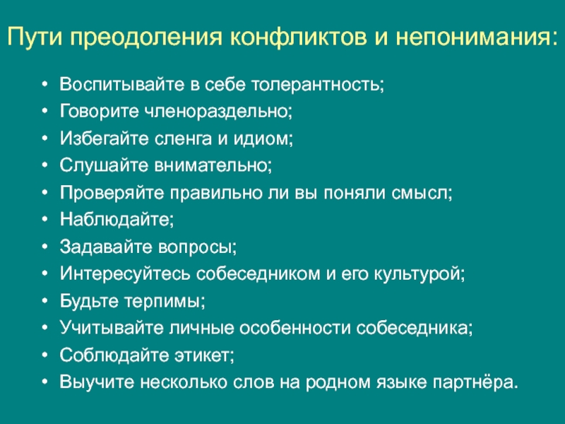 Пути преодоления конфликтов и непонимания:Воспитывайте в себе толерантность;Говорите членораздельно;Избегайте сленга и идиом;Слушайте внимательно;Проверяйте правильно ли вы поняли