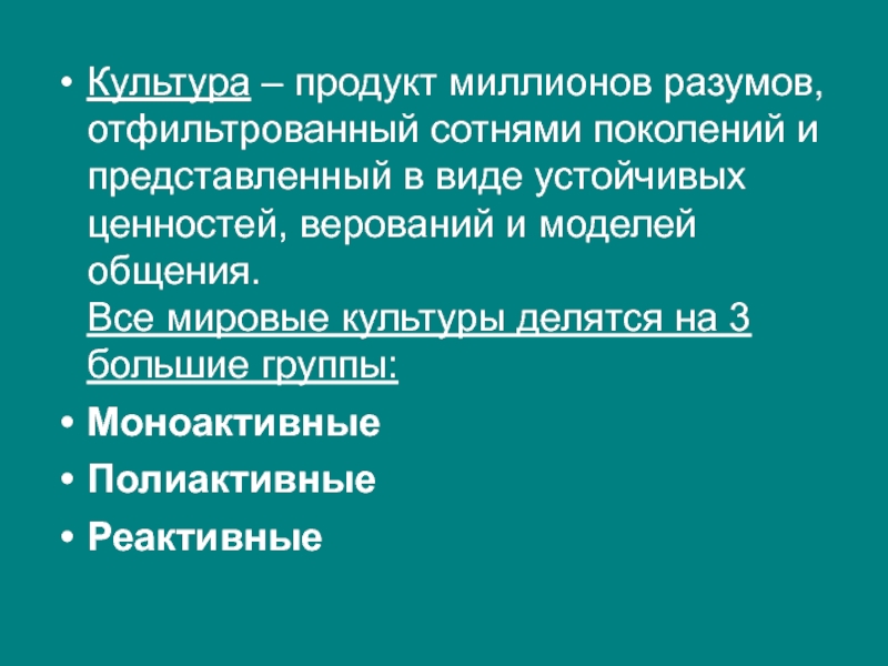 Культура – продукт миллионов разумов, отфильтрованный сотнями поколений и представленный в виде устойчивых ценностей, верований и моделей
