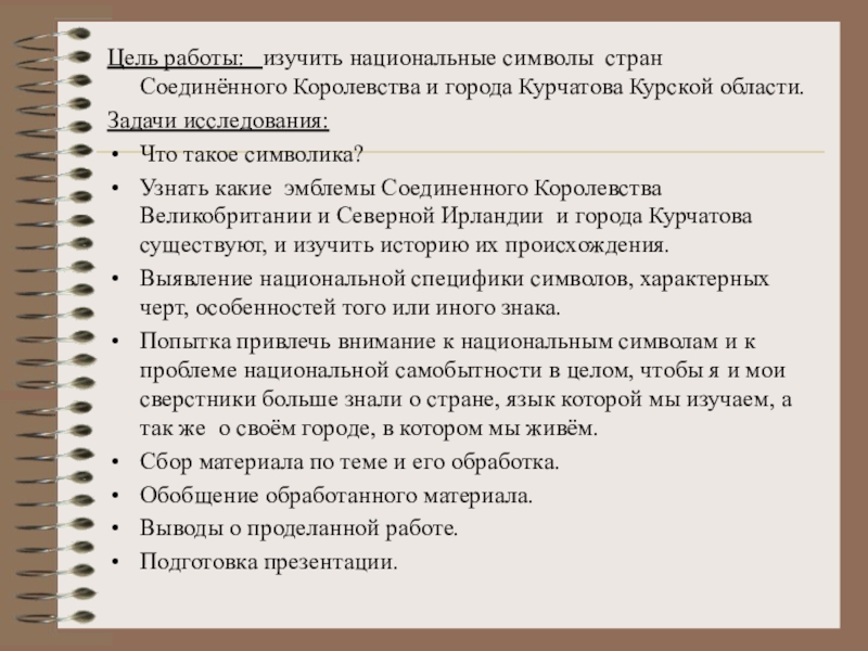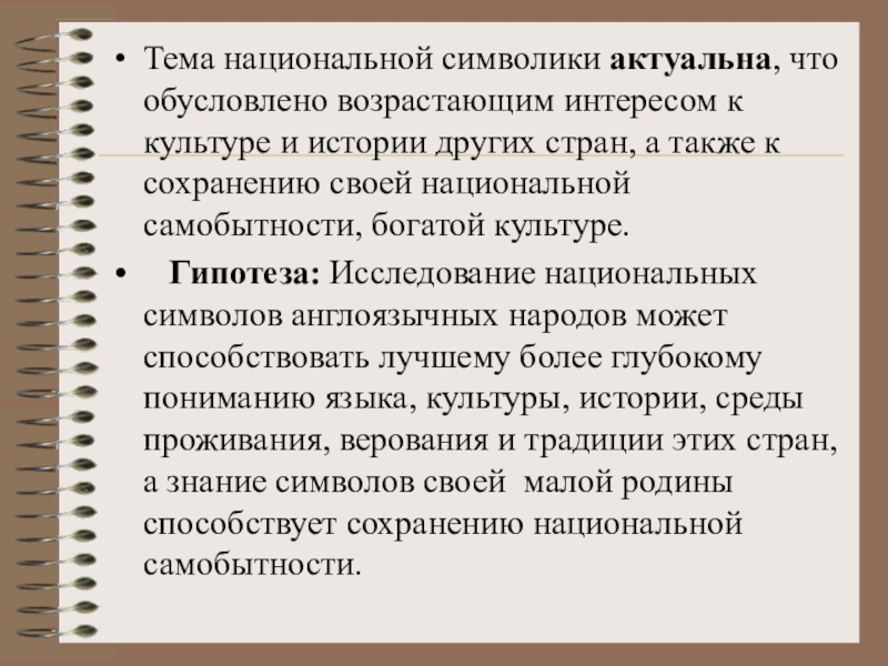 Гипотеза: Исследование национальных символов англоязычных народов может способствовать лучшему более глубокому пониманию языка, культуры, истории, среды проживания, верования и традиции этих стран, а знание символов своей малой родины способствует сохранению национальной самобытности.