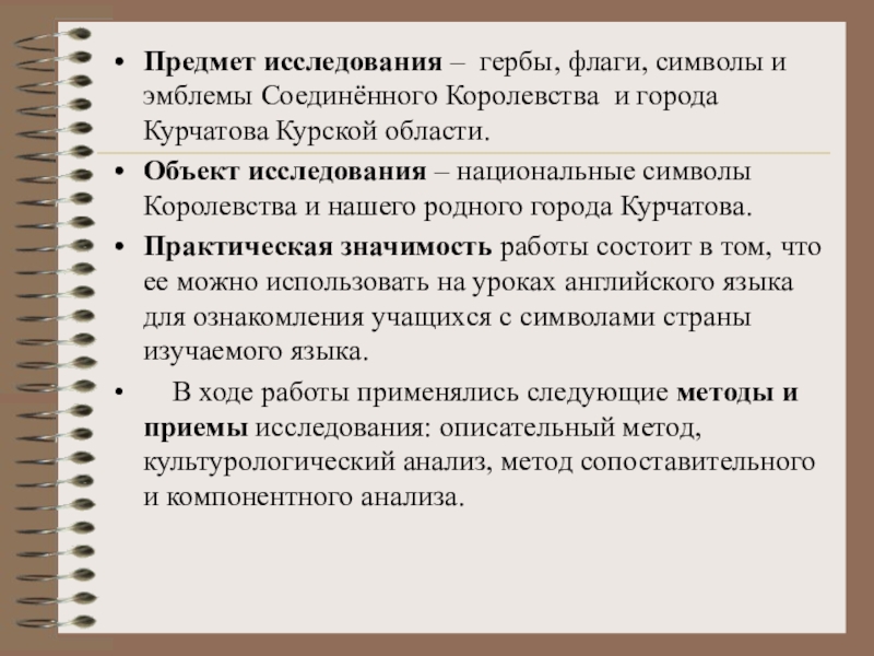 Объект исследования – национальные символы Королевства и нашего родного города Курчатова.