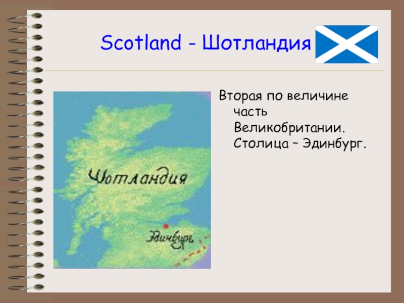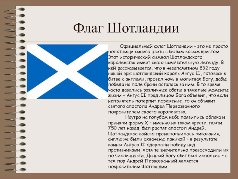 с белым косым крестом. Этот исторический символ Шотландского королевства имеет свою замечательную легенду. В ней рассказывается, что в незапамятном 832 году нашей эры шотландский король Ангус II, готовясь к битве с англами, провел ночь в молитвах Богу, дабы победа на поле брани осталась за ним. В то время часто давались различные обеты в тяжелые моменты жизни – Ангус II пред лицом Бога объявил, что если неприятель потерпит поражение, то он объявит святого апостола Андрея Первозванного покровителем своего королевства.
