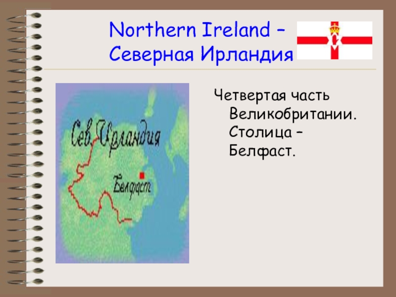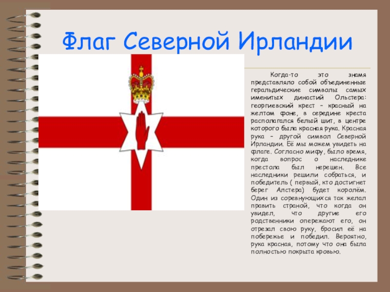 именитых династий Ольстера: георгиевский крест – красный на желтом фоне, в середине креста располагался белый шит, в центре которого была красная рука. Красная рука – другой символ Северной Ирландии. Её мы можем увидеть на флаге. Согласно мифу, было время, когда вопрос о наследнике престола был нерешен. Все наследники решили собраться, и победитель ( первый, кто достигнет берег Алстера) будет королём. Один из соревнующихся так желал править страной, что когда он увидел, что другие его родственники опережают его, он отрезал свою руку, бросил её на побережье и победил. Вероятно, рука красная, потому что она была полностью покрыта кровью.
