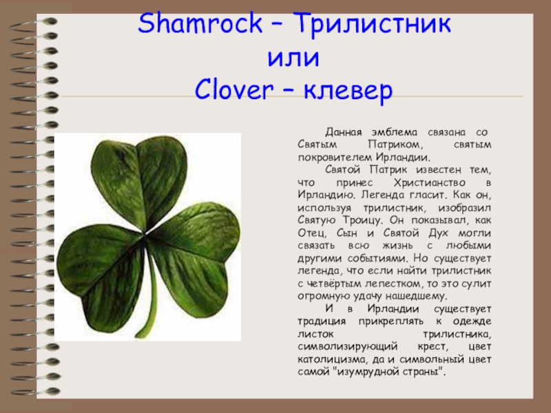 Святой Патрик известен тем, что принес Христианство в Ирландию. Легенда гласит. Как он, используя трилистник, изобразил Святую Троицу. Он показывал, как Отец, Сын и Святой Дух могли связать всю жизнь с любыми другими событиями. Но существует легенда, что если найти трилистник с четвёртым лепестком, то это сулит огромную удачу нашедшему.