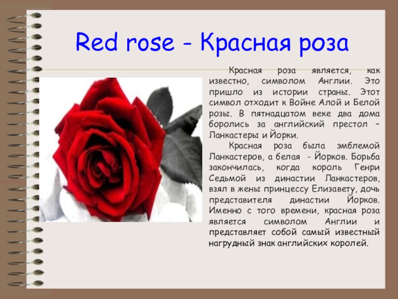 Красная роза была эмблемой Ланкастеров, а белая - Йорков. Борьба закончилась, когда король Генри Седьмой из династии Ланкастеров, взял в жены принцессу Елизавету, дочь представителя династии Йорков. Именно с того времени, красная роза является символом Англии и представляет собой самый известный нагрудный знак английских королей.