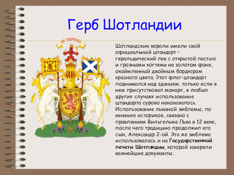 открытой пастью и грозными когтями на золотом фоне, окаймленный двойным бордюром красного цвета. Этот флаг-штандарт поднимался над зданием, только если в нем присутствовал монарх, в любых других случаях использование штандарта сурово наказывалось. Использование львиной эмблемы, по мнению историков, связано с правлением Вильгельма Льва в 12 веке, после чего традицию продолжил его сын, Александр 2-ой. Эта же эмблема использовалась и на Государственной печати Шотландии, которой заверяли важнейшие документы.