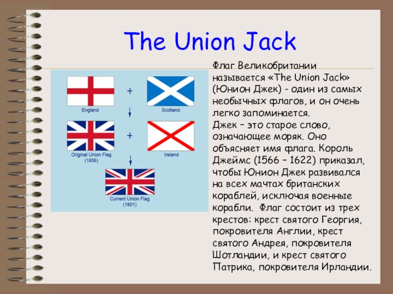 Джек – это старое слово, означающее моряк. Оно объясняет имя флага. Король Джеймс (1566 – 1622) приказал, чтобы Юнион Джек развивался на всех мачтах британских кораблей, исключая военные корабли. Флаг состоит из трех крестов: крест святого Георгия, покровителя Англии, крест святого Андрея, покровителя Шотландии, и крест святого Патрика, покровителя Ирландии.